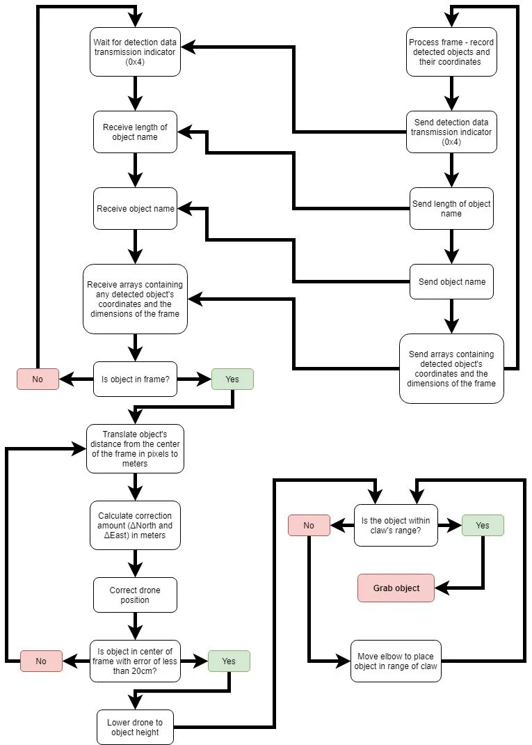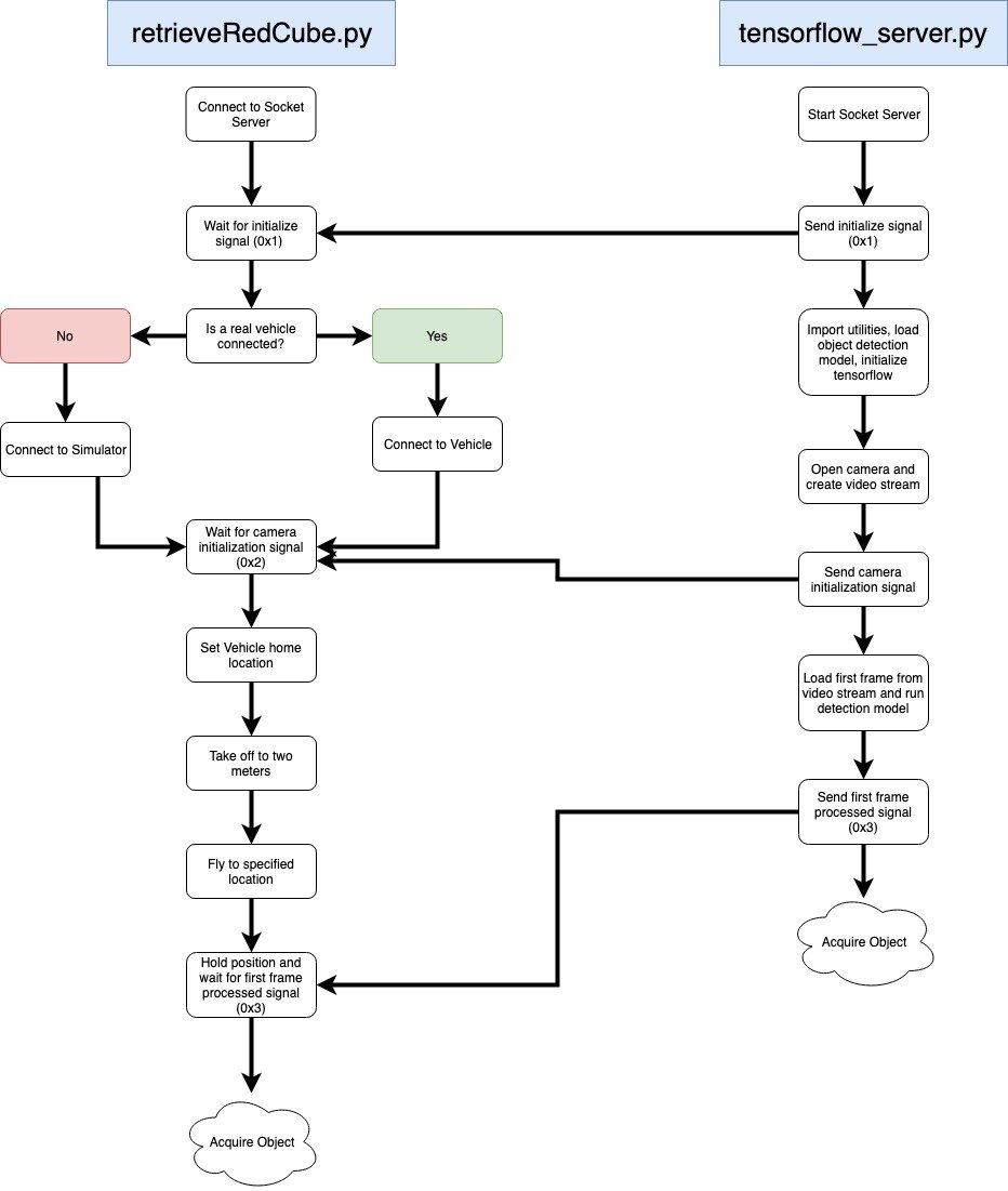 Writing code for this system was extremely hard, as tensorflow, the API I used for object detection is only compatible with Python 3, while dronekit was only compatible with Python 2 at the time (I was recently able to compile and install it for Python 3, so I believe they’re since added support). I solved this problem by using sockets to allow Python 2 and Python 3 scripts to talk to each other. I ended up with two parallel programs that follow the flow chart below: