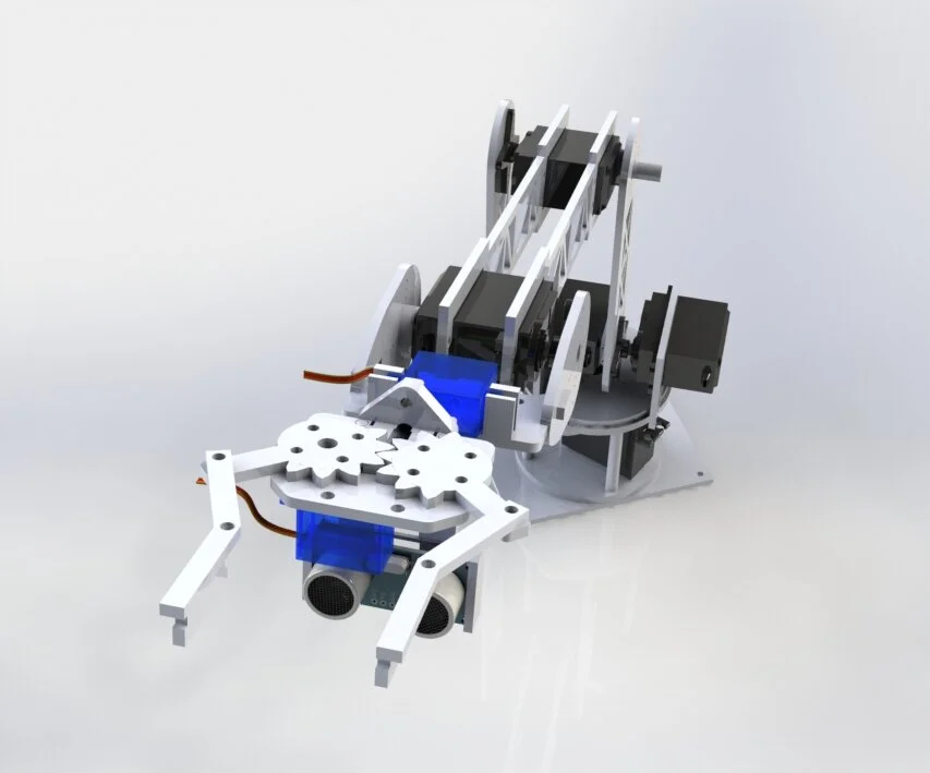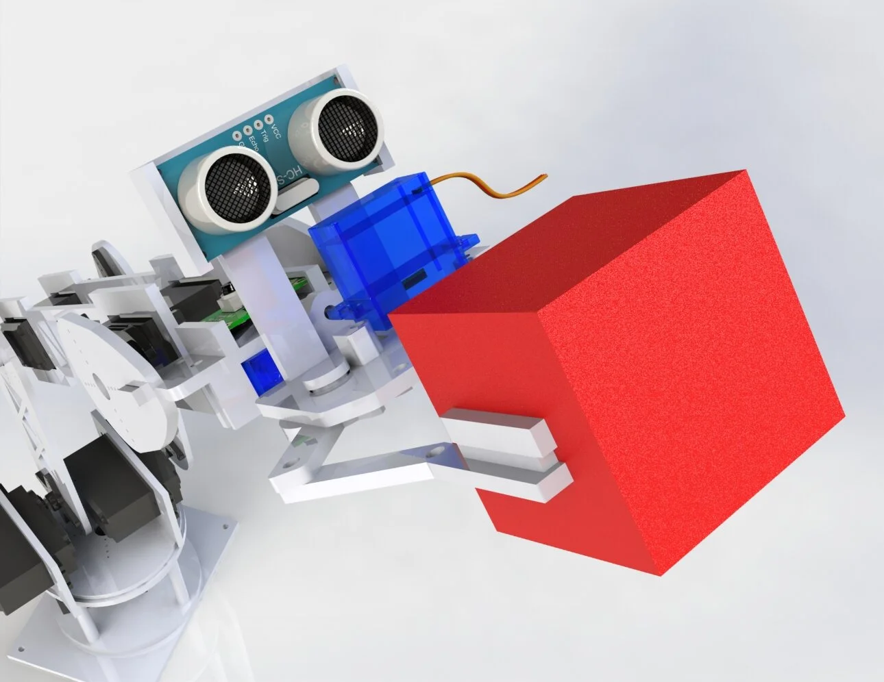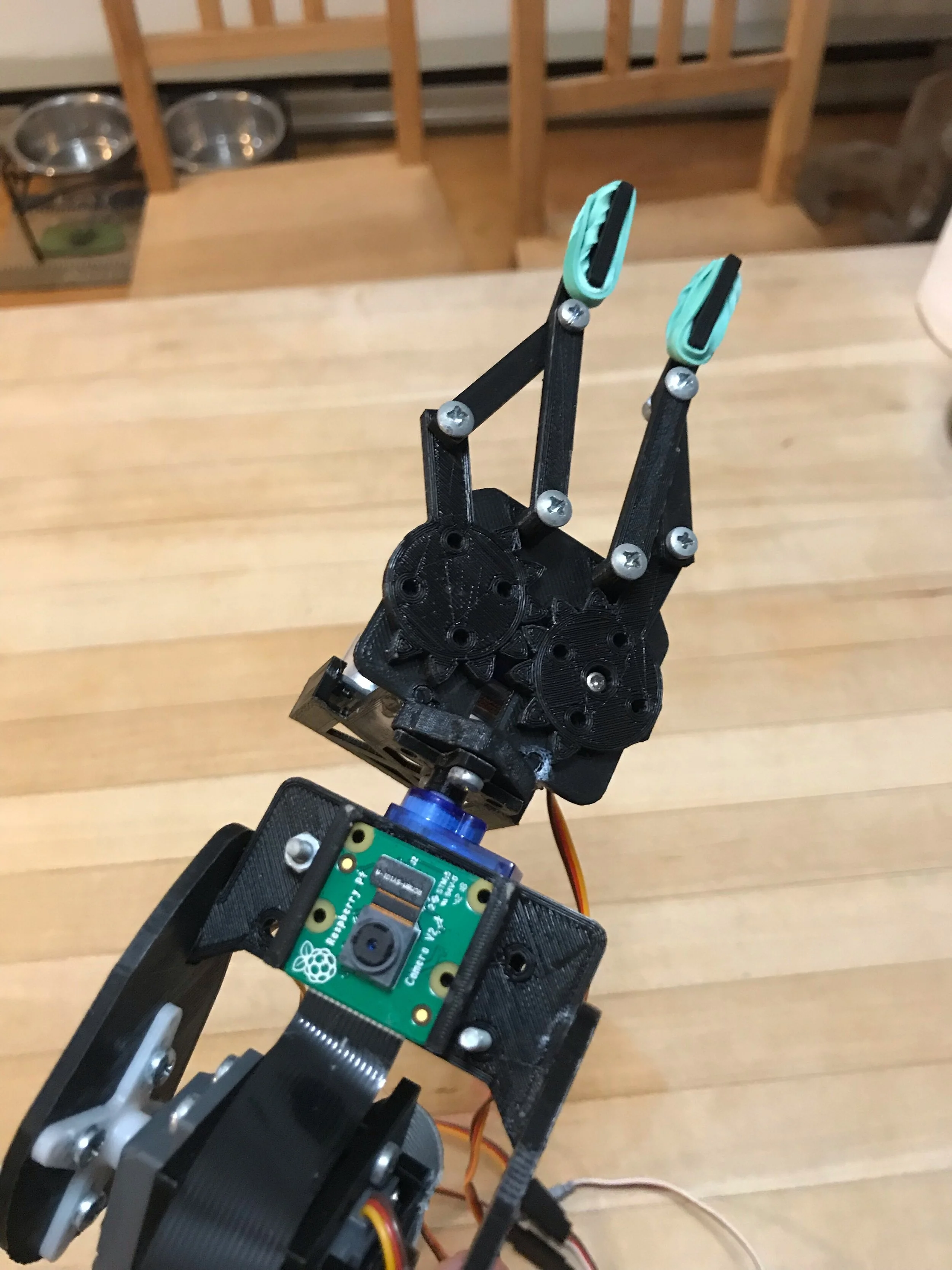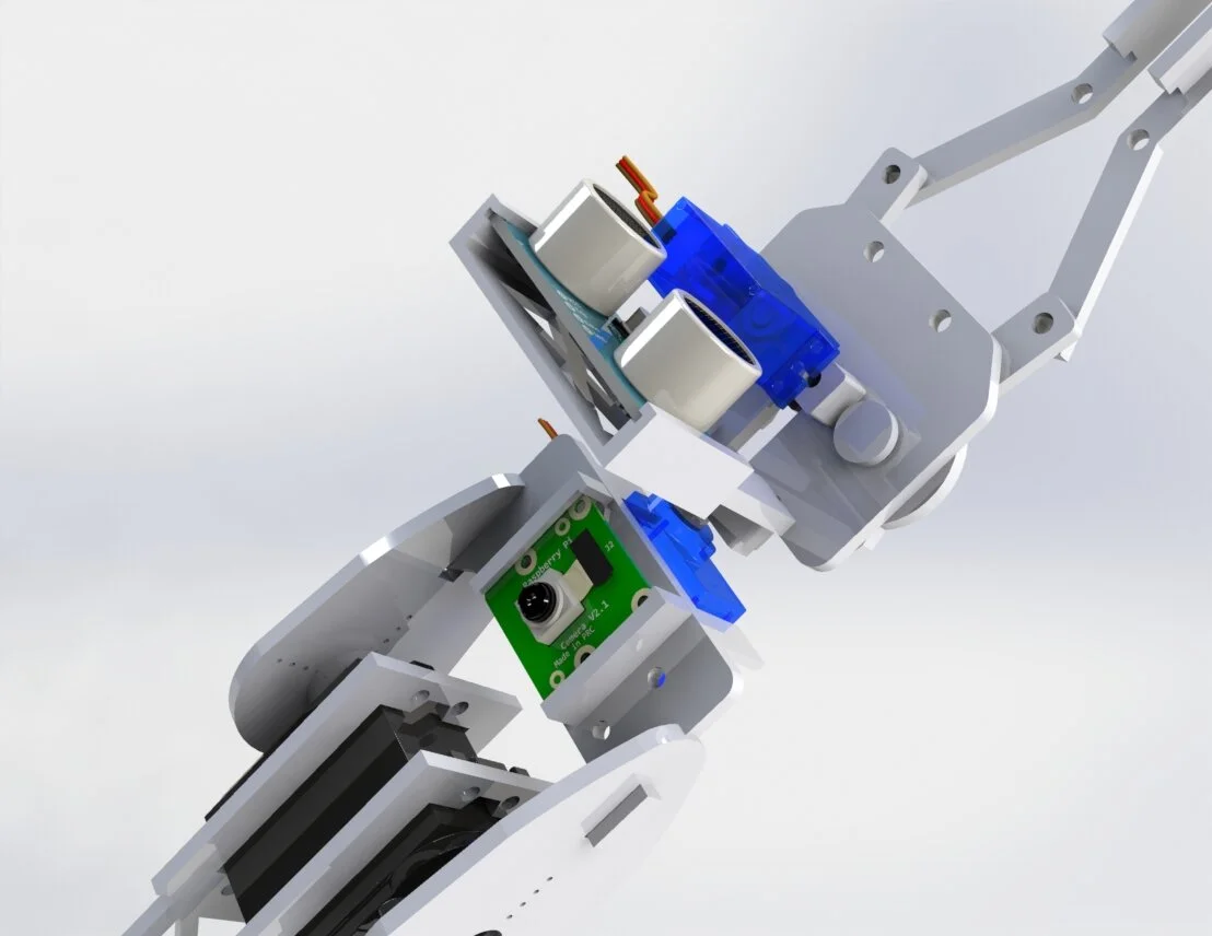 The robot arm contains 34 self-designed parts and is completely 3D printable with the exception of the electronics. Designed in Solidworks, it stands at just over half a meter tall and is actuated by 7 servos, giving it six degrees of freedom. It’s fitted with a raspberry pi camera and HC-06 ultrasonic sensor for autonomous object detection and retrieval. It can either be controlled programatically in java or python or can be switched into “manual” mode where it mirrors a user’s arm gestures using a leap motion controller. The entire arm costs only $95 to manufacture!